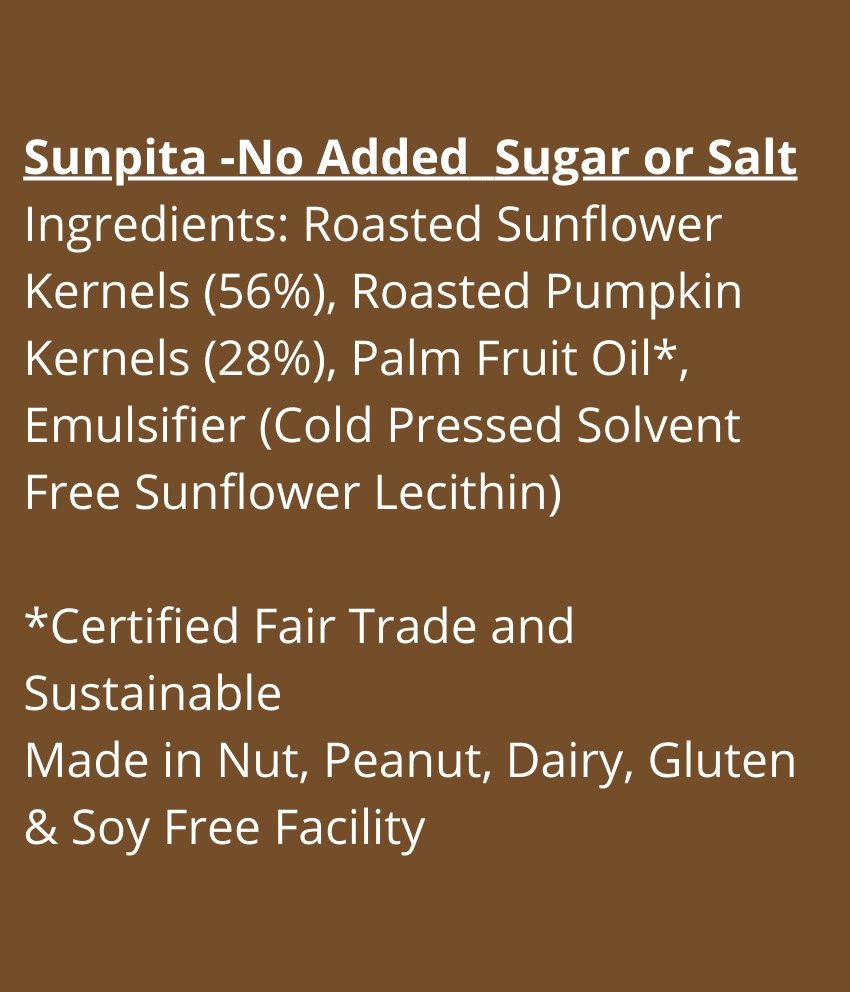 Our “No Added Sugar or Salt” Sunpita is a super-smooth, and spreadable artisan seed butter in a beautiful jar, made only with high quality sunflower seeds and pumpkin kernels (pepitas) which are roasted to perfection.